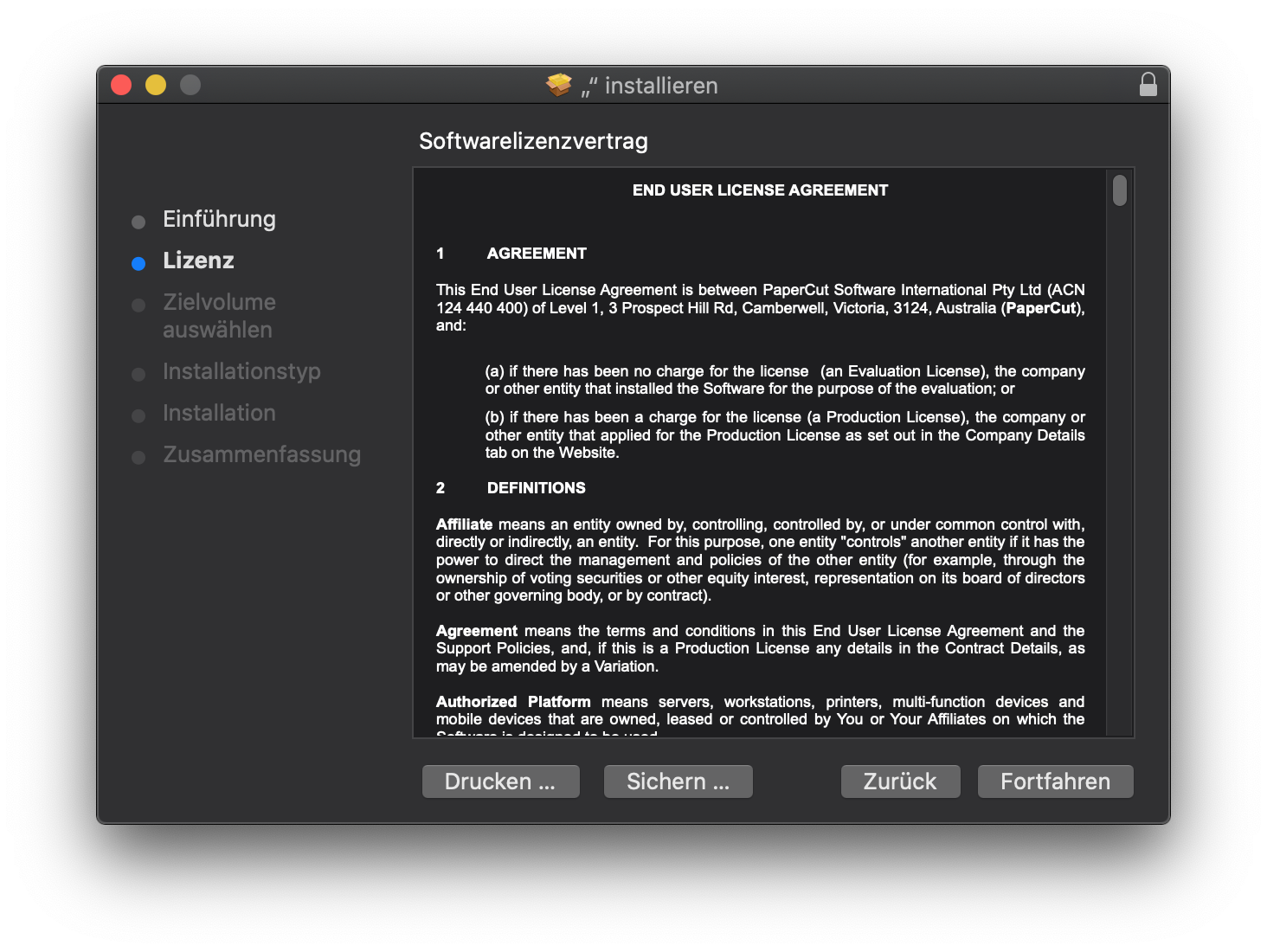 Installation durch Klick auf „PaperCut Print Deploy Client.pgk“ starten