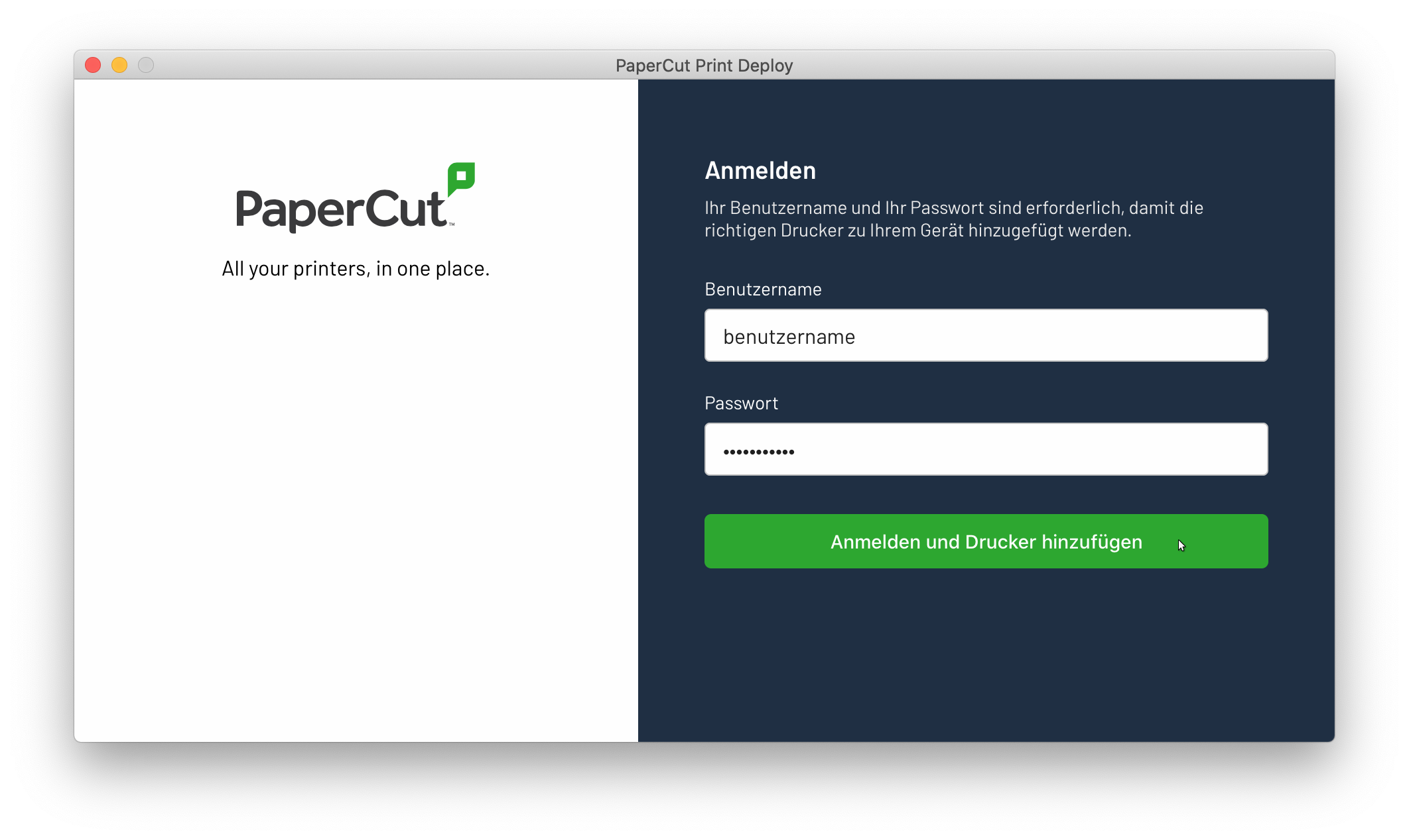 Anmeldung am PaperCut Print Deploy Client mit Benutzername (nicht eMail-Adresse!) und Passwort der Schule - nach der Installation sollte unterer Anmeldebildschirm automatisch erscheinen.