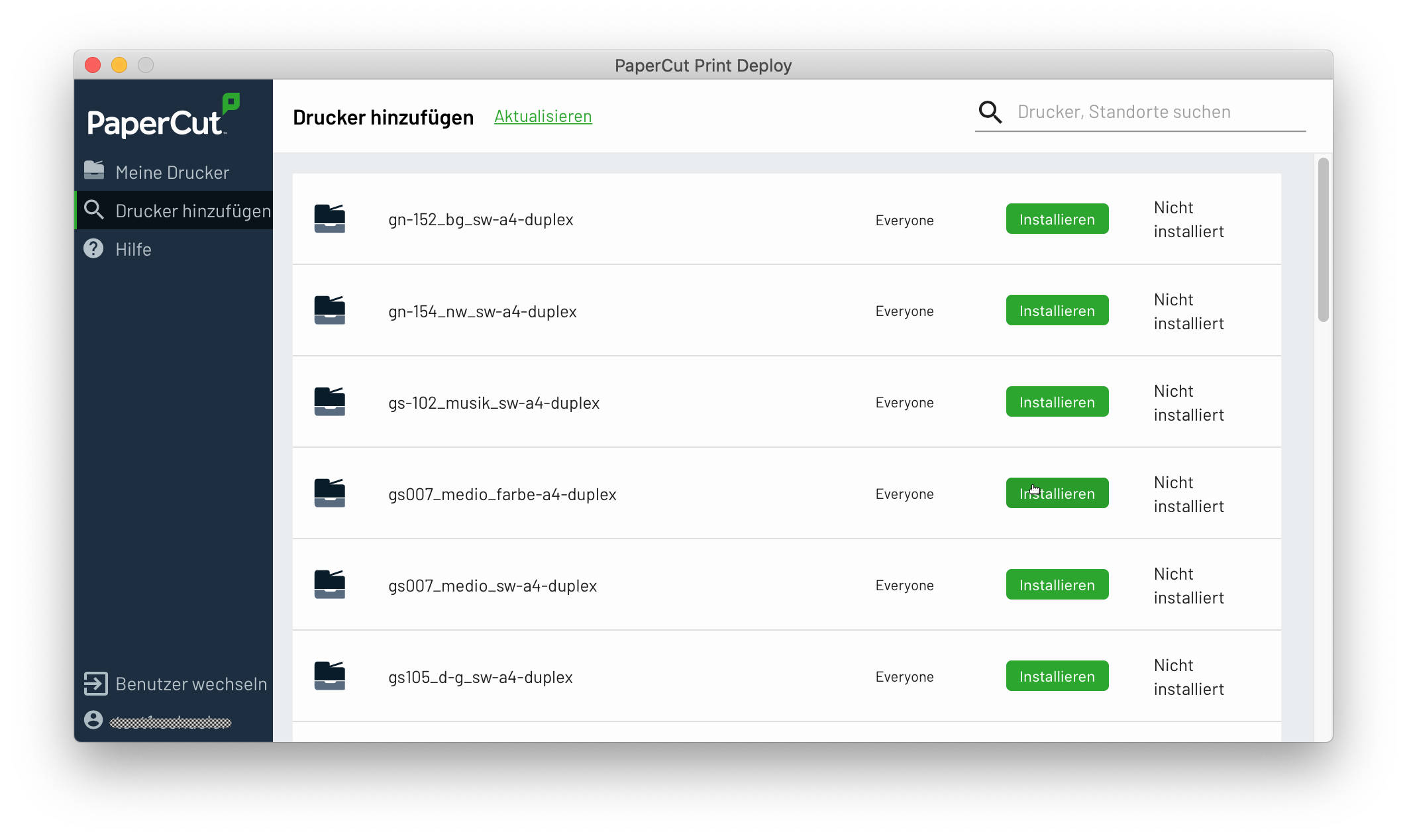 Drucker, welche installiert werden sollen, über jeweiligen Klick auf Button „Installieren“ auswählen.