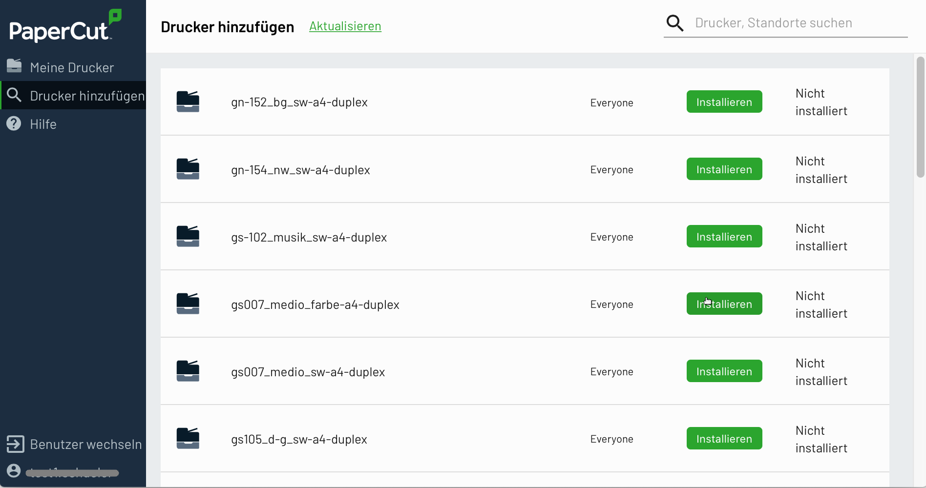Drucker, welche installiert werden sollen, über jeweiligen Klick auf Button „Installieren“ auswählen.