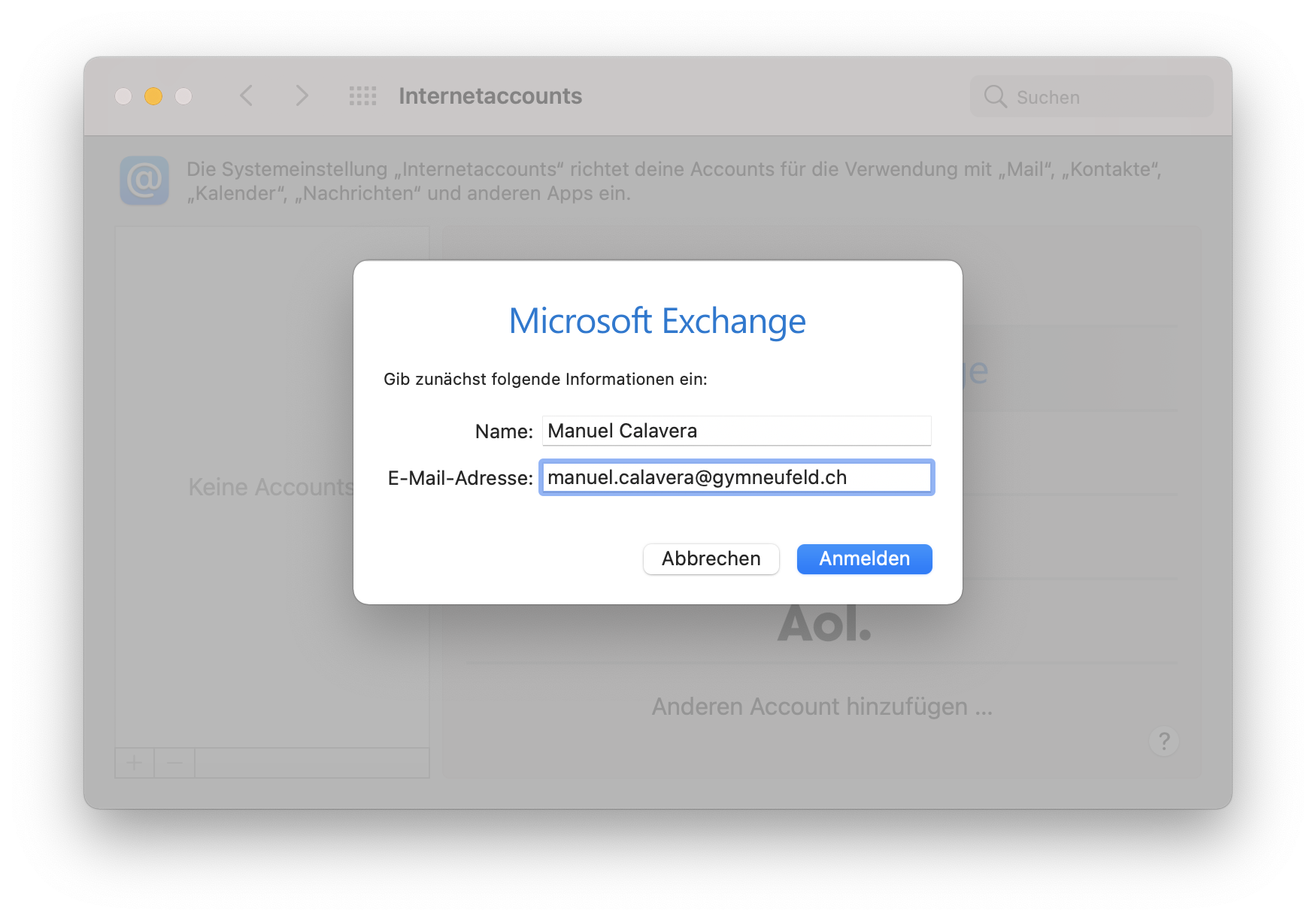 Geben Sie Ihren Namen und Ihre Schul-E-Mail-Adresse ein. Klicken Sie anschliessend auf Anmelden:
